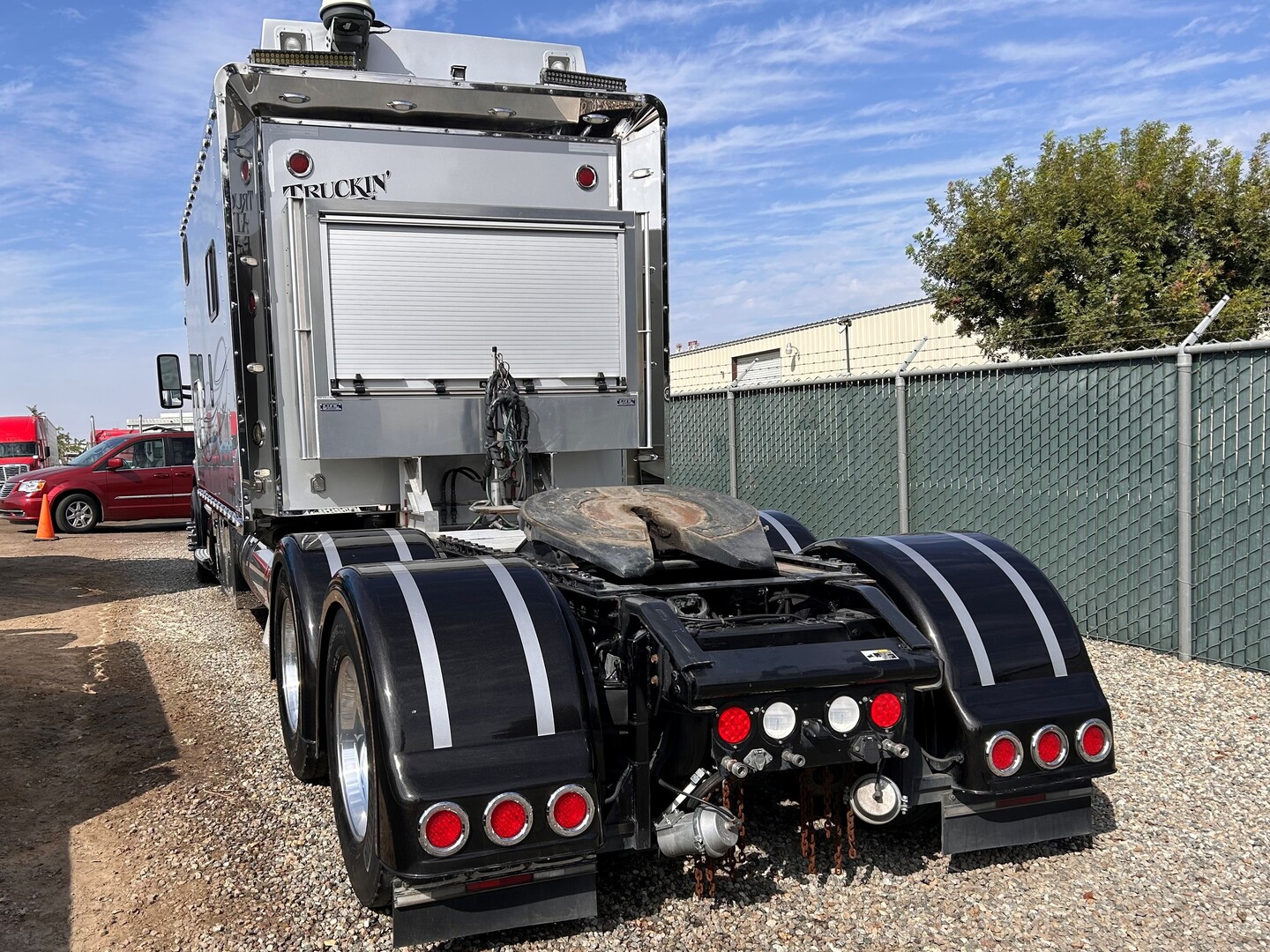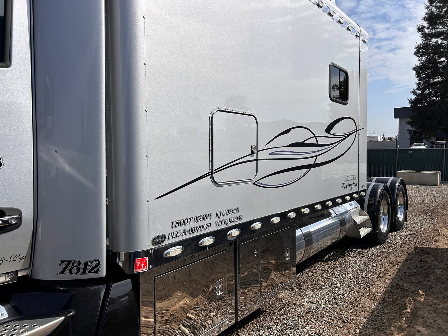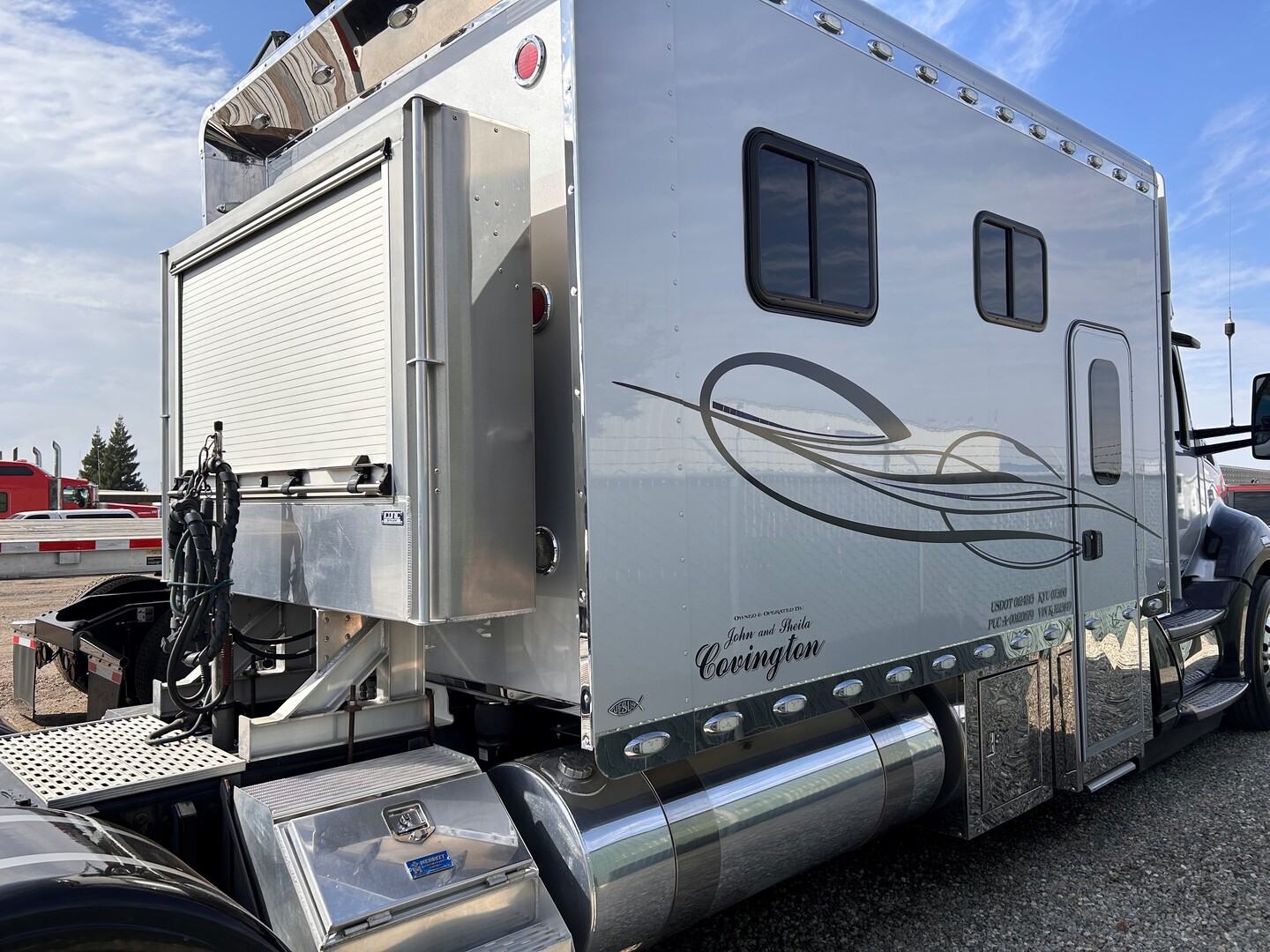 UV protected windows legal, tires-steer 365/70 225, drives 295/750225, Qualcomm, full fenders in rear, bypass filter, new rods & oil pump, overhead done at 550,000 miles, auto snow, chains, new generator, greaseless u-joints & carrier greaseless 5th wheel, in cab kingpin release, upper & lower air & electric lines, rollup headache rack, air monitor in cab for cat eyes on tires, soft start on sleeper air conditioner, new TV w/swivel mount, digital scales for truck & trailer in cab, new springs on front axle.
