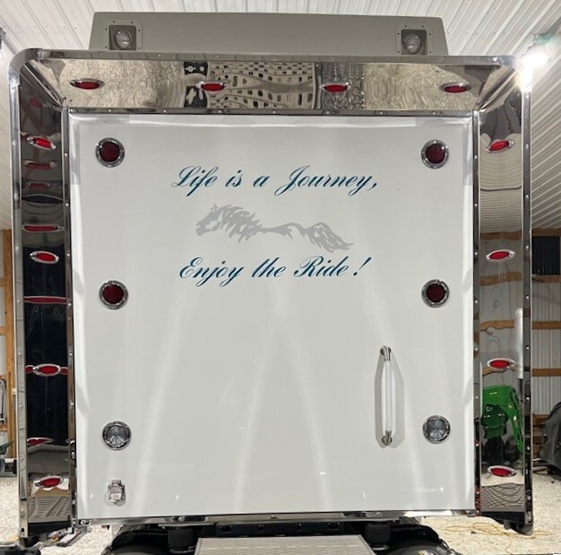 Upgraded Sleeper Options Include: All Inclusive Upgraded Interior Décor Package – Stone Saddle; Side Entry Door & Stepwell Layout to PS with Flip Down Flush Floor, Flip Up Counter, LED Grab Handle, LED Exterior Light, and Electric Exterior Step; LED Strip Lighting to Stepwell Treads – Blue; Bed Dinette with Self-Storing Table, Self-Storing Cushions, and Bed Struts; Microwave Convection Oven; 2nd Fresh Water Tank to Interior Cabinet Space; Tank Monitor – Fresh Water Tank; Medicine Cabinet with Mirror & Adjustable Shelf; Single Burner Induction Cooktop; Hardwood Trim to Refrigerator Cooktop; Roof Vent with Wireless Remote; Hardwood Trim to Roof Vent; 2 & 3 Drawers Added to Existing Cabinet; Upgraded 42” Wide Screen HD TV; In-Motion Satellite System-HD Ready; Dish Network HD DVR; Vinyl Mattress Curtain; Hardwood Dinette Bases; Soft White Strip Lighting to All Overhead Cabinets on One Switch; Décor Light Mounted on Ceiling; Décor Reading Light in Main Bed Area; Dimmer Switch for Ceiling Lights; Dimmer Switch for Bed & Dinette Area; Blue LED Strip Light Below Countertop Lip; 3-Way Switch in Cab Tied to Countertop Lights; Baseboard Heater 110 Volt; Onan 7500 Watt Quiet Diesel 3 cyl Generator in 40” Stainless Steel Box; Onan Auto Generator Start with HVAC; Onan Start/Stop Switch to Cab Dash Panel; Coleman Roof Air Conditioner 13.5k BTU with Ducted Air, Drain Kit & Heat Strip; Fiberglass Wind Deflector; U-Shaped Side Fairings; 5 Bag Air Ride System; Ride Control Valves for 5-Bag Air Ride System; Oversized 40” Stainless Steel Tool Box to 52” with 2 Doors; Stainless Steel DEF 20” to 30”; 20” Stainless Steel Tool Box; Stainless Steel Below Cab Doors; Stainless & 2 Clearance Lights to Side Entry Door;; U-Shaped Stainless Steel Fairing Enclosures; Deckplate with Super Step & Grab Handle; 26 LED Clearance Lights Top of Sleeper; 6 LED Clearance Lights Below Cab Doors; 2 Pairs Red LED Load Lights; 1 Pair Clear/White LED Load Lights; 1 Pair Docking Lights; 5 LED (1-3-1) Bus Lights; 14” x 14” Window In Shower; 24” x 16” Window DS with Wood Trim and Shade; Install Backsplash Above Countertop Area – Rust Slate; (12) Red Piranha Lights in U-Shaped Fairing Enclosures; and Much More!